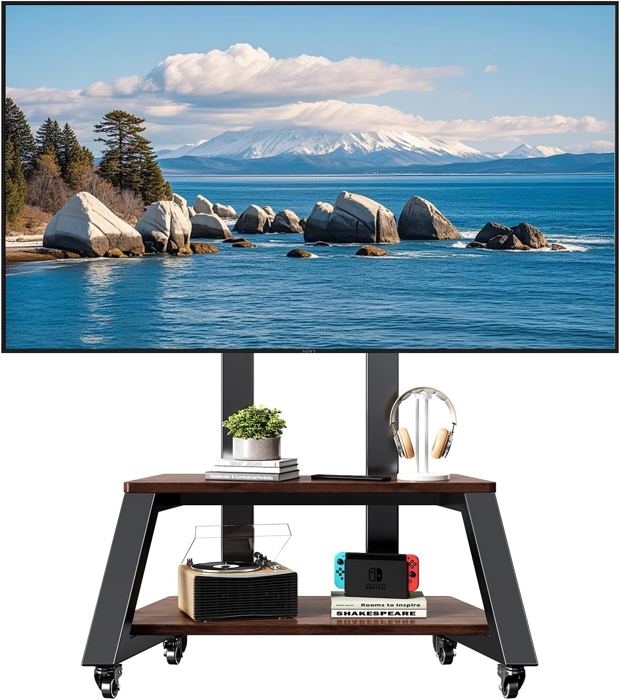 πΊ Mobile TV Stand with Wheels for 32–86 Inch Screens | Height Adjustable Heavy-Duty Rolling TV Cart with Double Wooden Shelf & Locking Casters | Max VESA 600×450mm, Holds up to 180 lbs (Walnut Finish)